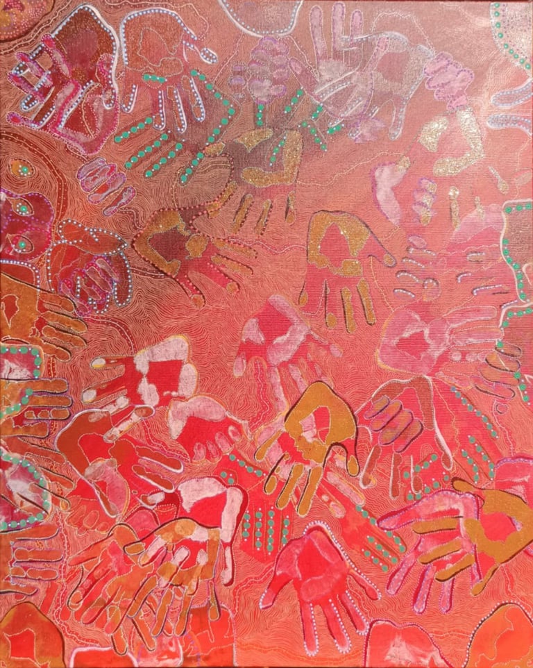 La surface de contact violente sur la zone sensible de la peau à fleur de peur. Dans ce chaos la couleur vient apaiser la douleur, invite au temps qui passe et qui change les couleurs pour revenir au naturel instinctif. Ces mains qui sont naturellement une zone d'échange guérisseuses permettant la transmutation en cicatrices lumineuses pour l'âme.